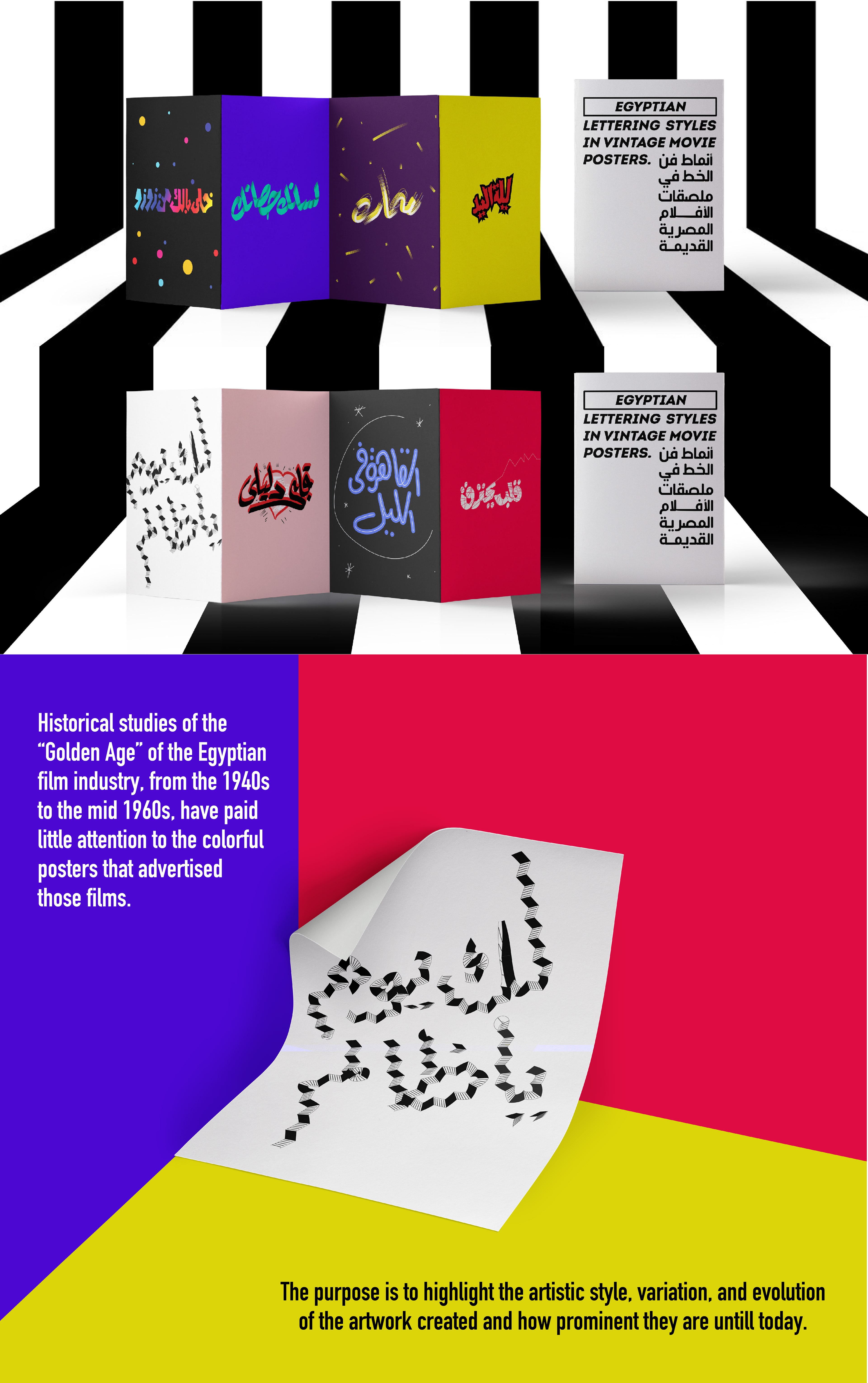 Historical studies of the “golden age” of the Egyptian film industry, from the 1940s to the mid1960-s, have paid little attention to the colorful posters that advertised those films. The purpose is to highlight the artistic style, variation, and evolution of the artwork created and how prominent they are until today. The project is an attempt to create a documentation as well as to classify the different lettering styles as a guide to designers and art enthusiasts where they can easily build on creating works and even construct future digitized typefaces based on the Egyptian advertising flavors at the age of modernism.